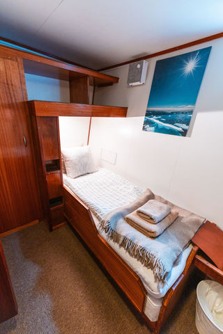 Our ship offers five double cabins and one triple cabin for guests, all with ensuite facilities. The cabins were previously used to house surveyors and crew on hydrographic survey missions while the vessel was operating on the survey market. For expedition purposes, the cabins and bathrooms have been renovated and upgraded to ensure a comfortable stay.